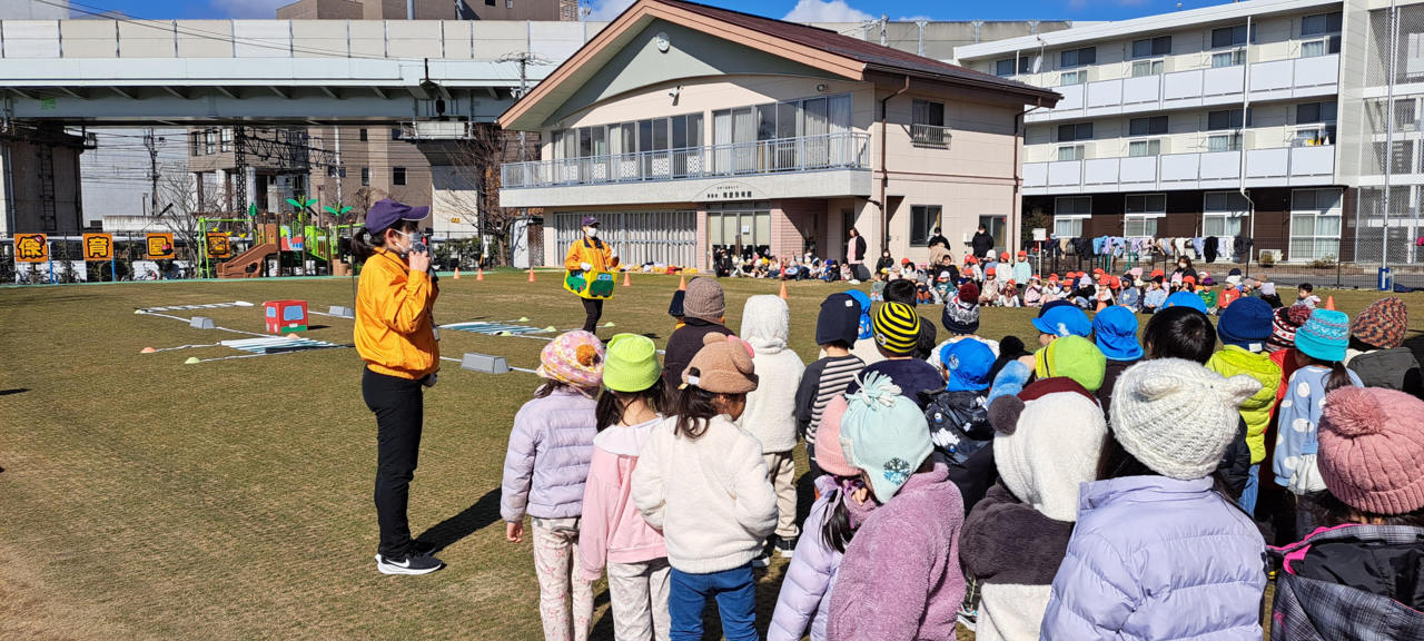 先日、もうすぐ卒園を控えた年長カモメ組さんを対象に、長野県交通安全教育支援センターの皆さんが交通安全教室を行って下さいました。